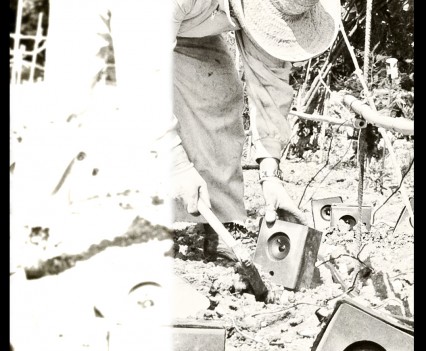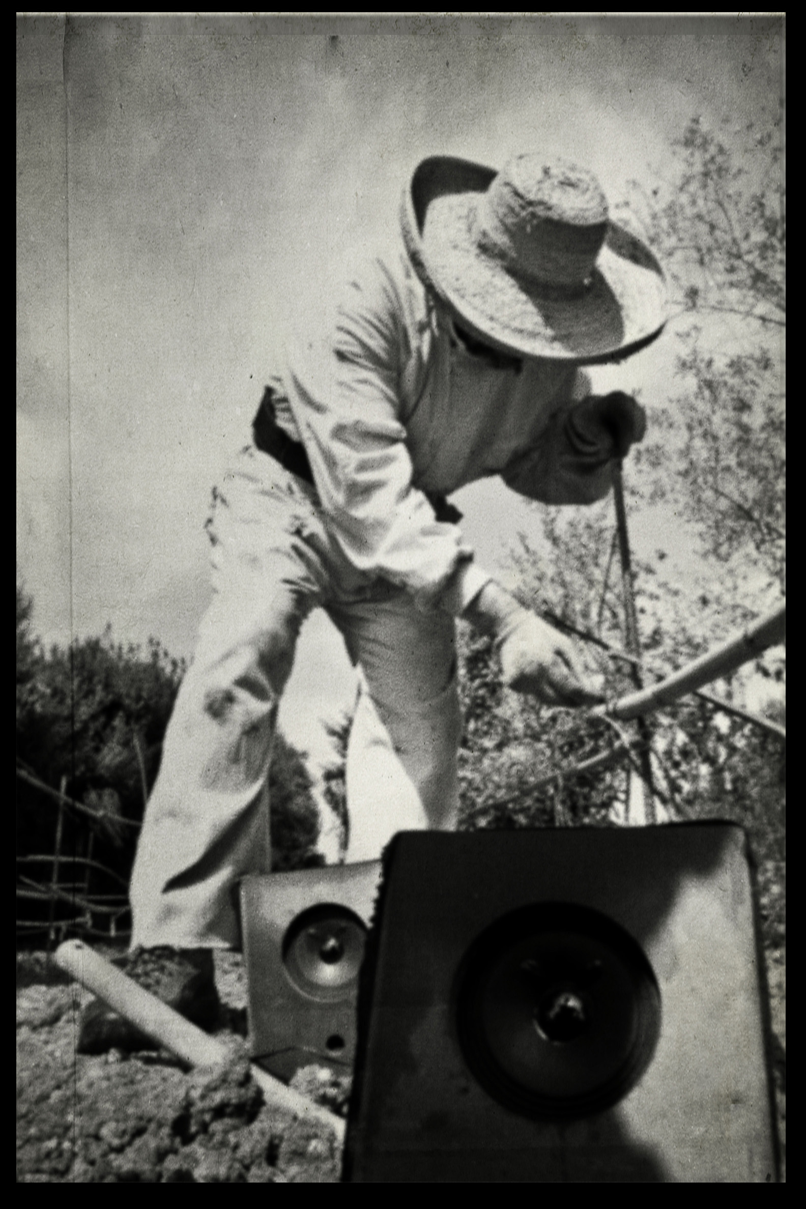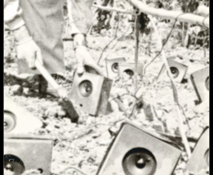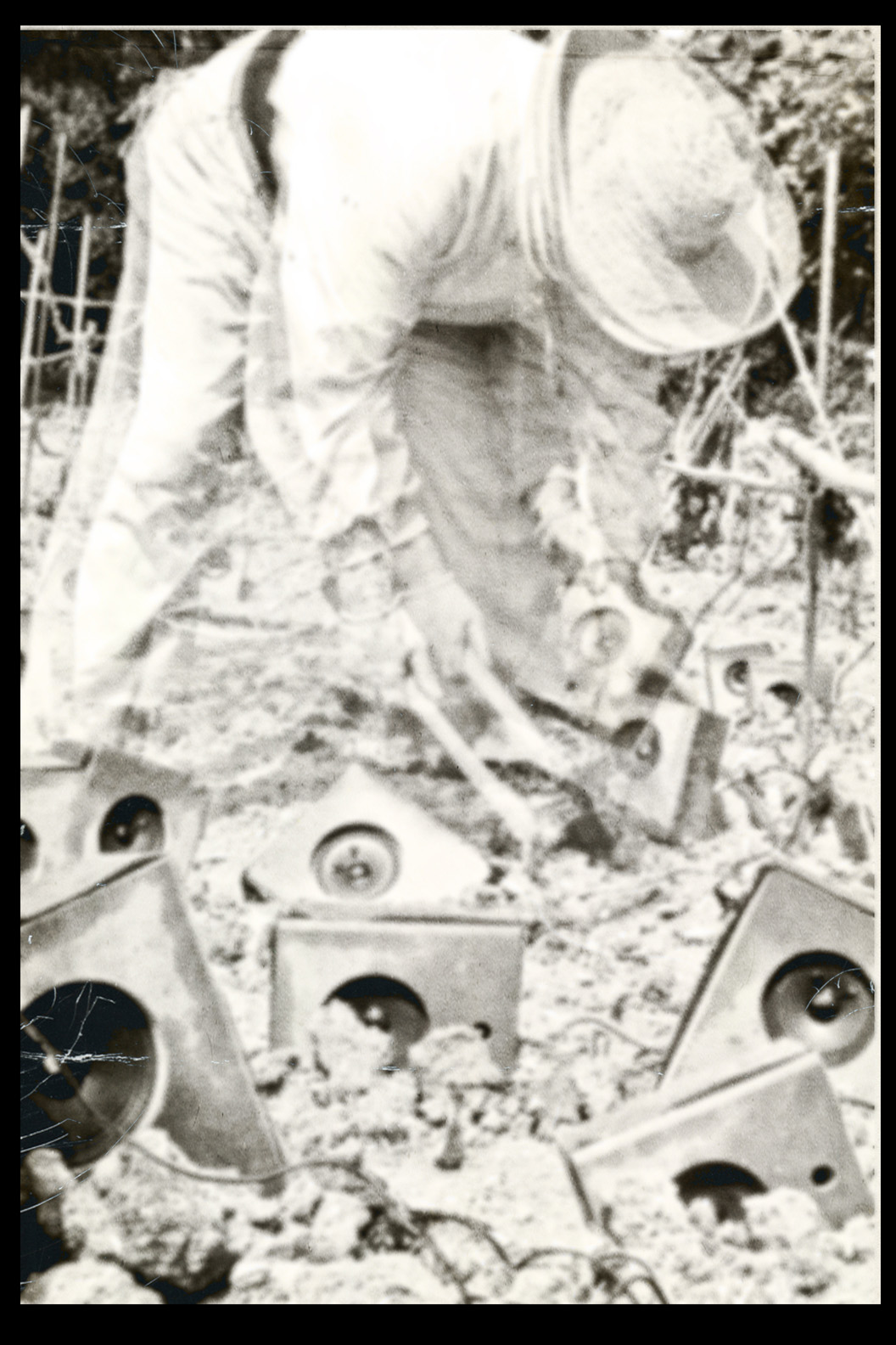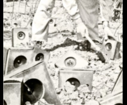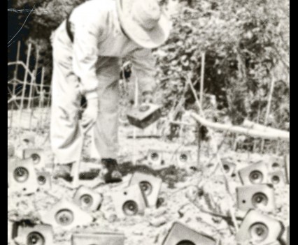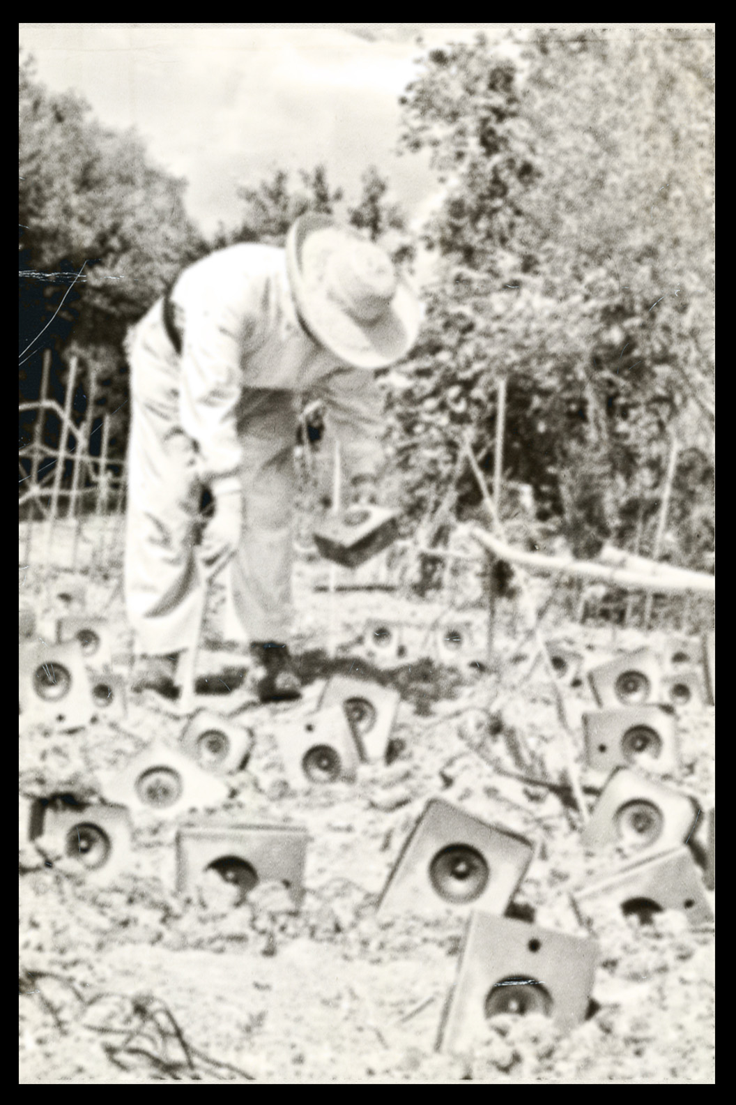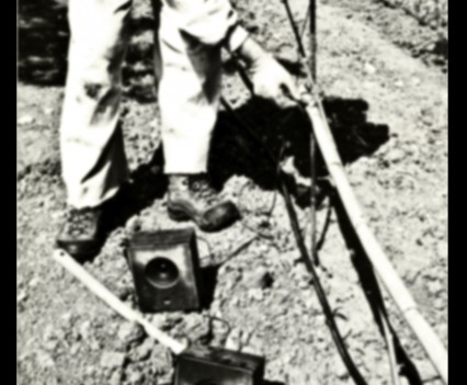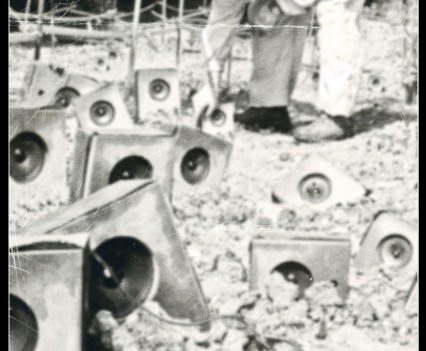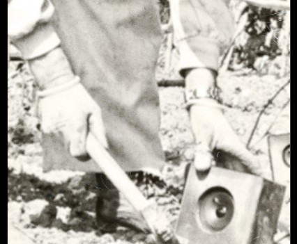 Photos founded in the file “8722. Expansion of the Communication Network” on Bushkrug. We can see Stanislav Dravoneg cultivating speakers in a orchard, and we guess that is in nearby of the transmitter antenna Britz, because it sees on the horizon. Probably was hacking the broadcast signal of the American sector, according to the documents that we found.
